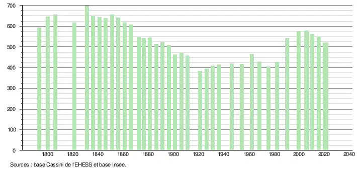 L'évolution du nombre d'habitants est connue à travers les recensements de la population effectués dans la commune depuis 1793. Pour les communes de moins de 10 000 habitants, une enquête de recensement portant sur toute la population est réalisée tous les cinq ans, les populations légales des années intermédiaires étant quant à elles estimées par interpolation ou extrapolation[15]. Pour la commune, le premier recensement exhaustif entrant dans le cadre du nouveau dispositif a été réalisé en 2005[16].