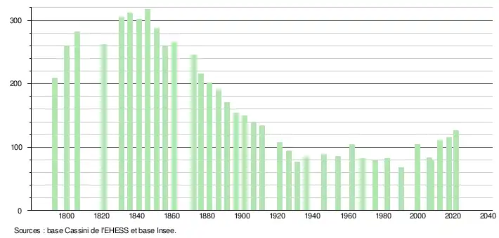 L'évolution du nombre d'habitants est connue à travers les recensements de la population effectués dans la commune depuis 1793. Pour les communes de moins de 10 000 habitants, une enquête de recensement portant sur toute la population est réalisée tous les cinq ans, les populations légales des années intermédiaires étant quant à elles estimées par interpolation ou extrapolation[18]. Pour la commune, le premier recensement exhaustif entrant dans le cadre du nouveau dispositif a été réalisé en 2007[19].