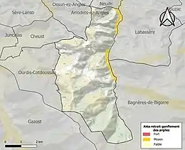 Les communes les plus proches[Note 1] sont[4] : Ourdis-Cotdoussan (3,0 km), Arrodets-ez-Angles (3,0 km), Ossun-ez-Angles (3,0 km), Neuilh (3,1 km), Labassère (3,2 km), Cheust (3,4 km), Sère-Lanso (4,4 km), Gazost (4,6 km).