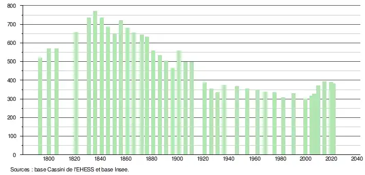 L'évolution du nombre d'habitants est connue à travers les recensements de la population effectués dans la commune depuis 1793. Pour les communes de moins de 10 000 habitants, une enquête de recensement portant sur toute la population est réalisée tous les cinq ans, les populations légales des années intermédiaires étant quant à elles estimées par interpolation ou extrapolation[28]. Pour la commune, le premier recensement exhaustif entrant dans le cadre du nouveau dispositif a été réalisé en 2004[29].