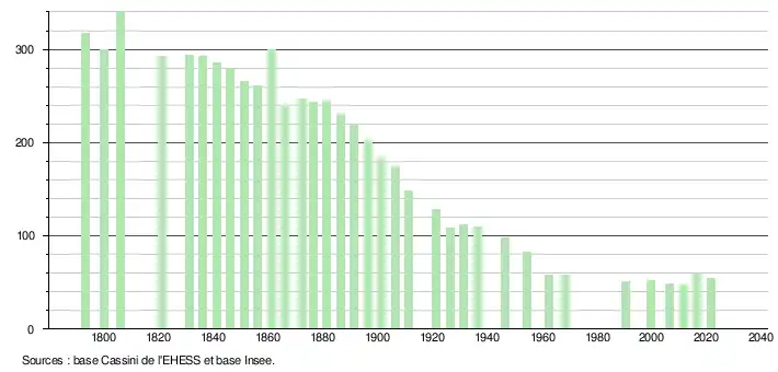 L'évolution du nombre d'habitants est connue à travers les recensements de la population effectués dans la commune depuis 1793. Pour les communes de moins de 10 000 habitants, une enquête de recensement portant sur toute la population est réalisée tous les cinq ans, les populations légales des années intermédiaires étant quant à elles estimées par interpolation ou extrapolation[15]. Pour la commune, le premier recensement exhaustif entrant dans le cadre du nouveau dispositif a été réalisé en 2006[16].