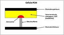 Une technologie en cours de développement est la mémoire à changement de phase (PCM ou Phase Change Memory). Cette technologie exploite le changement de propriété physique d’un alliage sous un effet Joule (chaleur)[91] : Le matériau change de résistivité (facteur 3 à 4) entre un état dit « cristallin » et un autre dit « amorphe ». La PCM consomme en moyenne moins d’énergie et est plus rapide en lecture qu’une mémoire DRAM. Cependant, des limitations importantes existent : le matériau a une longévité moindre due à l’altération graduelle du matériau lorsqu’on le chauffe pour le changer d’état ; la consommation énergétique est ponctuellement plus importante qu’une DRAM classique en phase d’écriture ; enfin, le délai d’écriture est également plus important qu’avec les DRAM[92]. Les mémoires non volatiles (NVM) dont font partie les PCM sont des technologies prometteuses pour la gestion de l’énergie dans les systèmes embarqués[93]. La comparaison avec les mémoires volatiles sont à l’avantage des NVM[94], même si ces composants ont des inconvénients.