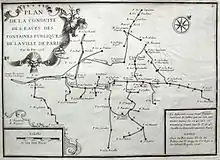 L’alimentation en eau potable à Paris est assurée à parts égales par le prélèvement des eaux souterraines c’est-à-dire provenant des sources et puits, et les eaux dites superficielles issues de la Seine et des rivières[15].
