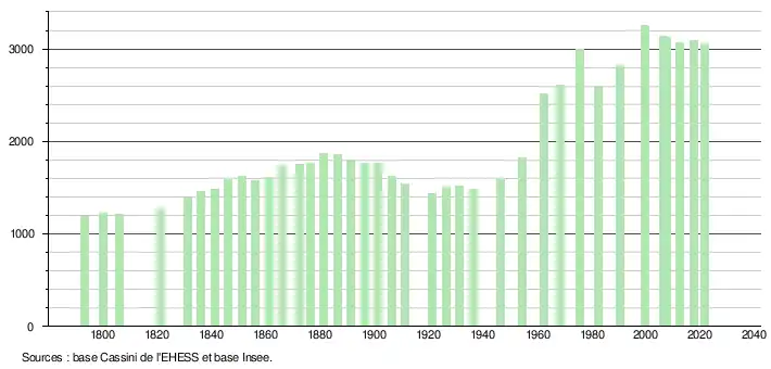 L'évolution du nombre d'habitants est connue à travers les recensements de la population effectués dans la commune depuis 1793. Pour les communes de moins de 10 000 habitants, une enquête de recensement portant sur toute la population est réalisée tous les cinq ans, les populations légales des années intermédiaires étant quant à elles estimées par interpolation ou extrapolation[32]. Pour la commune, le premier recensement exhaustif entrant dans le cadre du nouveau dispositif a été réalisé en 2007[33].