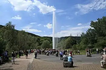 L'eau du geyser provient d'un puits d'une profondeur de 350 mètres. Des éruptions régulières peuvent à nouveau être observées depuis le 7 juillet 2006. Pour des raisons de sécurité, le jet d'eau est fermé par la plaque coulissante en dehors des heures de visite.