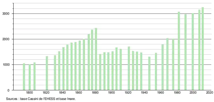 L'évolution du nombre d'habitants est connue à travers les recensements de la population effectués dans la commune depuis 1793. À partir du , les populations légales des communes sont publiées annuellement dans le cadre d'un recensement qui repose désormais sur une collecte d'information annuelle, concernant successivement tous les territoires communaux au cours d'une période de cinq ans. Pour les communes de moins de 10 000 habitants, une enquête de recensement portant sur toute la population est réalisée tous les cinq ans, les populations légales des années intermédiaires étant quant à elles estimées par interpolation ou extrapolation[26]. Pour la commune, le premier recensement exhaustif entrant dans le cadre du nouveau dispositif a été réalisé en 2007[27],[Note 1].