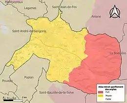La commune est vulnérable au risque de mouvements de terrains constitué principalement du retrait-gonflement des sols argileux[25]. Cet aléa est susceptible d'engendrer des dommages importants aux bâtiments en cas d’alternance de périodes de sécheresse et de pluie. La totalité de la commune est en aléa moyen ou fort (59,3 % au niveau départemental et 48,5 % au niveau national). Sur les 2 028 bâtiments dénombrés sur la commune en 2019, 2 028 sont en aléa moyen ou fort, soit 100 %, à comparer aux 85 % au niveau départemental et 54 % au niveau national. Une cartographie de l'exposition du territoire national au retrait gonflement des sols argileux est disponible sur le site du BRGM[26],[Carte 2].