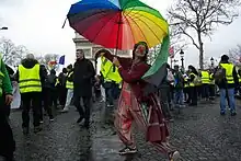Le gilet de haute visibilité, dit « gilet jaune », est utilisé comme symbole et signe de ralliement ; porté par les manifestants, il est également placé par des soutiens du mouvement au-dessus du tableau de bord ou sur la plage arrière de leur véhicule[55],[56]. Faisant suite à des appels d’anonymes sur les réseaux sociaux, le mouvement se traduit par des blocages d'axes routiers et des manifestations chaque samedi — dénommées « actes » —, qui sont plusieurs fois violentes, notamment à Paris. La durée de cette contestation est un phénomène unique sous la Ve République.