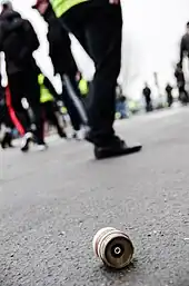 De nombreux manifestants sont blessés en raison de l'utilisation d'armes proscrites ailleurs en Europe pour ce type d'intervention et considérées par certains fabricants[alpha 5] comme des armes de guerre : lanceurs de balle de défense (Flash-Ball) et grenades de désencerclement (notamment des grenades GLI-F4)[130]. Au , Checknews de Libération dénombre 144 blessés graves parmi les Gilets jaunes et journalistes, 92 l'étant à la suite de tirs de lanceurs de balles de défense[125]. Des médias se font l'écho de tirs tendus avec des lanceurs de lacrymogènes à hauteur d'homme, et le président de Gendxxi reconnaît que des LBD ont été utilisés « de façon un peu déviante, comme une arme d'attaque et non de défense »[131],[132]. Des vidéos montrent des policiers tirant avec des LBD à hauteur de tête[133],[134],[135]. La Gendarmerie mobile justifie l’utilisation de l'explosif GLI-F4 par la volonté de préserver l'intégrité physique des forces de l'ordre[123]. Fin , six organisations, dont la Ligue des droits de l'homme, l'UNEF et le Syndicat de la magistrature, estimant que les LBD doivent être interdits, demandent au Conseil d'État de saisir le Conseil constitutionnel pour faire « cesser ces atteintes graves et répétées aux droits fondamentaux » », mais leur demande est rejetée[136],[129]. Le Défenseur des droits, Jacques Toubon, réclame également que les lanceurs de balle de défense et les grenades explosives soient interdits en raison de la dangerosité qu'ils présenteraient « pour l'intégrité » des manifestants[137],[138].