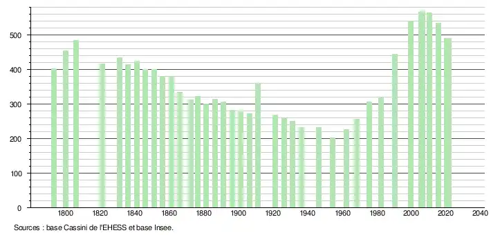 L'évolution du nombre d'habitants est connue à travers les recensements de la population effectués dans la commune depuis 1793. Pour les communes de moins de 10 000 habitants, une enquête de recensement portant sur toute la population est réalisée tous les cinq ans, les populations légales des années intermédiaires étant quant à elles estimées par interpolation ou extrapolation[25]. Pour la commune, le premier recensement exhaustif entrant dans le cadre du nouveau dispositif a été réalisé en 2005[26].