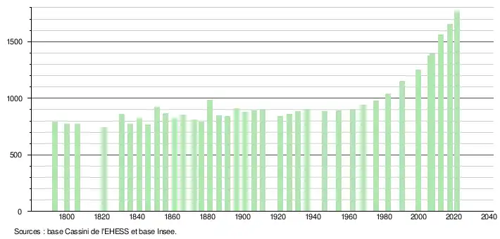 L'évolution du nombre d'habitants est connue à travers les recensements de la population effectués dans la commune depuis 1793. Pour les communes de moins de 10 000 habitants, une enquête de recensement portant sur toute la population est réalisée tous les cinq ans, les populations légales des années intermédiaires étant quant à elles estimées par interpolation ou extrapolation[21]. Pour la commune, le premier recensement exhaustif entrant dans le cadre du nouveau dispositif a été réalisé en 2007[22].