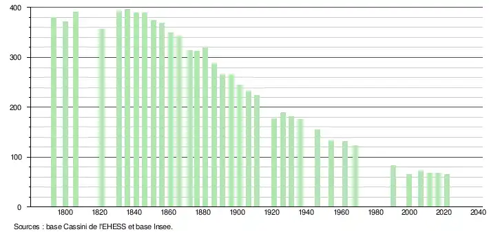 L'évolution du nombre d'habitants est connue à travers les recensements de la population effectués dans la commune depuis 1793. Pour les communes de moins de 10 000 habitants, une enquête de recensement portant sur toute la population est réalisée tous les cinq ans, les populations légales des années intermédiaires étant quant à elles estimées par interpolation ou extrapolation[14]. Pour la commune, le premier recensement exhaustif entrant dans le cadre du nouveau dispositif a été réalisé en 2006[15].