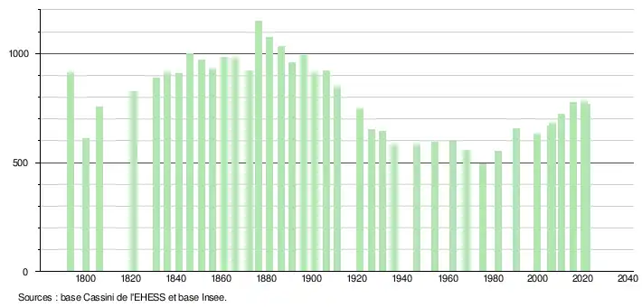 L'évolution du nombre d'habitants est connue à travers les recensements de la population effectués dans la commune depuis 1793. Pour les communes de moins de 10 000 habitants, une enquête de recensement portant sur toute la population est réalisée tous les cinq ans, les populations légales des années intermédiaires étant quant à elles estimées par interpolation ou extrapolation[22]. Pour la commune, le premier recensement exhaustif entrant dans le cadre du nouveau dispositif a été réalisé en 2005[23].