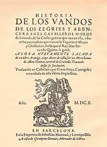 - Historia de los Vandos de los Cegries, y Abencerrages, cavalleros Moros de Granada, y las civiles guerras que huvo en ella, hasta que el rey Don Fernando el quinto la gano. Traducida en castellano por Gines Perez de Hita [...] Primera parte.