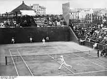 Giorgio De Stefani (en bas de l'image) lors d'une rencontre de Coupe Davis en 1930.
