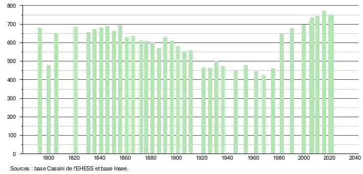 L'évolution du nombre d'habitants est connue à travers les recensements de la population effectués dans la commune depuis 1793. Pour les communes de moins de 10 000 habitants, une enquête de recensement portant sur toute la population est réalisée tous les cinq ans, les populations légales des années intermédiaires étant quant à elles estimées par interpolation ou extrapolation[13]. Pour la commune, le premier recensement exhaustif entrant dans le cadre du nouveau dispositif a été réalisé en 2005[14].