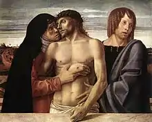 Le thème de la Pietà, qui groupe, selon un thème fréquent chez les Bellini, les figures de Marie de Nazareth, de saint Jean l’Évangéliste et du Christ au Tombeau, est l'autre thème qui s'est tissé dès les débuts de Giovanni alors qu’il n’a que 21 ans et s'est poursuivi tout au long de sa carrière. Cette iconographie s'inspire également de modèles byzantins, les 'imago pietatis. Les prototypes de la série sont le Christ mort entouré de Marie et de Saint Jean l'Évangéliste cobnservée à l'Académie Carrara de Bergame et la Piéta du musée Poldi-Pezzoli, datable entre les années cinquante et soixante, suivies du Christ mort soutenu par deux anges du Musée Correr, aux influences mantegnesques, la célèbre Pietà de la pinacothèque de Brera (vers 1465-1470) et celle de Rimini, datable vers 1474[6]. On peut dater de la même année la Transfiguration et le Christ au mont des Oliviers.