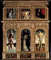 Les saints du registre central se caractérisent par une forte plastique, soulignée par la grandeur des figures, les lignes excessives des anatomies et des drapés, et l'utilisation ingénieuse de la lumière rasante d'en bas pour certains détails, comme le visage de saint Christophe. L'espace est dominé par des paysages lointains en arrière-plan ; la profondeur de la perspective est suggérée par quelques éléments de base, comme les flèches raccourcies de saint Sébastien ou le long bâton de saint Christophe[9].