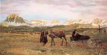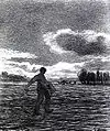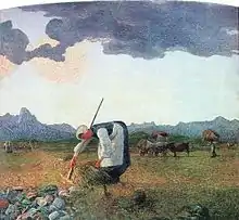 Chez Segantini, les êtres humains ont été intégrés dans le paysage dès le début et ont fusionné avec lui. Millet avait poétisé le paysan, l'avait exalté en termes romantiques et littéraires ; pour Segantini, les bergers et les paysans restent simples et sans aucun pathos. Avec Gustave Courbet, Millet découvre le paysan comme thème artistique, et le choix de ce thème est l'expression d'un programme socio-éthique. Millet voit le paysan en intellectuel, en citadin, de l'extérieur et comme une critique de la vie citadine. Malgré la similitude extérieure des motifs des deux artistes, ceux de Segantini ont une essence très différente. Il voulait simplement peindre ses modèles « [...], très différemment de Millet, heureux, beaux et contents, ne suscitant pas la pitié, certainement plus envieux quand on apprend à les connaître, de leur vie, comme je l’ai fait. »[40]