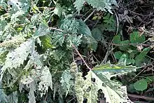 Les feuilles, de forme elliptique ou ovale et de disposition alterne, présentent parfois trois lobes, mais le nombre de lobes peut varier de zéro à sept, notamment selon les sous-espèces[5]. Chaque feuille mesure de 5 à 25 × 4 à 25 cm[5],[3] et présente trois nervures longitudinales (une médiane et deux latérales, une près de chaque bordure) réunies par trois à six paires de nervures latérales[5],[3]. Les nervures longitudinales portent souvent des poils urticants, alors que les nervures latérales ne portent généralement que des poils courts[3]. La bordure présente des dents régulières, symétriques ou pointant vers l'avant[5]. Les feuilles contiennent de minuscules cystolithes[5].