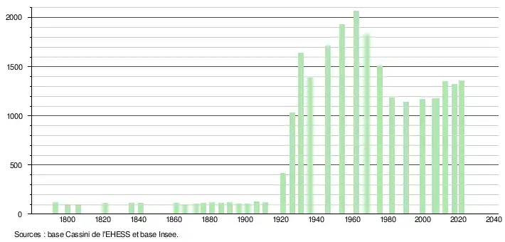 L'évolution du nombre d'habitants est connue à travers les recensements de la population effectués dans la commune depuis 1793. Pour les communes de moins de 10 000 habitants, une enquête de recensement portant sur toute la population est réalisée tous les cinq ans, les populations légales des années intermédiaires étant quant à elles estimées par interpolation ou extrapolation[19]. Pour la commune, le premier recensement exhaustif entrant dans le cadre du nouveau dispositif a été réalisé en 2007[20].