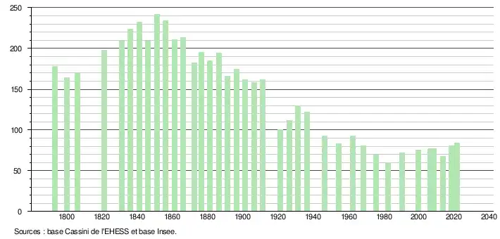 L'évolution du nombre d'habitants est connue à travers les recensements de la population effectués dans la commune depuis 1793. Pour les communes de moins de 10 000 habitants, une enquête de recensement portant sur toute la population est réalisée tous les cinq ans, les populations légales des années intermédiaires étant quant à elles estimées par interpolation ou extrapolation[16]. Pour la commune, le premier recensement exhaustif entrant dans le cadre du nouveau dispositif a été réalisé en 2008[17].