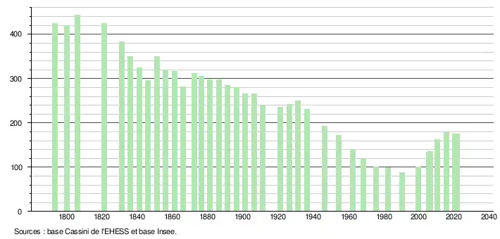 L'évolution du nombre d'habitants est connue à travers les recensements de la population effectués dans la commune depuis 1793. Pour les communes de moins de 10 000 habitants, une enquête de recensement portant sur toute la population est réalisée tous les cinq ans, les populations légales des années intermédiaires étant quant à elles estimées par interpolation ou extrapolation[18]. Pour la commune, le premier recensement exhaustif entrant dans le cadre du nouveau dispositif a été réalisé en 2005[19].