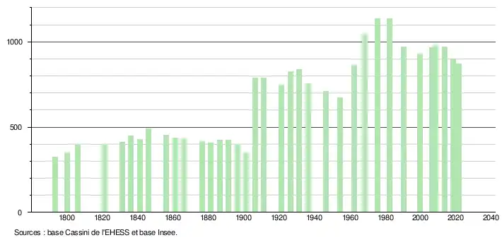 L'évolution du nombre d'habitants est connue à travers les recensements de la population effectués dans la commune depuis 1793. Pour les communes de moins de 10 000 habitants, une enquête de recensement portant sur toute la population est réalisée tous les cinq ans, les populations légales des années intermédiaires étant quant à elles estimées par interpolation ou extrapolation[16]. Pour la commune, le premier recensement exhaustif entrant dans le cadre du nouveau dispositif a été réalisé en 2008[17].
