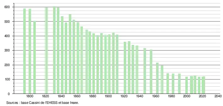 L'évolution du nombre d'habitants est connue à travers les recensements de la population effectués dans la commune depuis 1793. Pour les communes de moins de 10 000 habitants, une enquête de recensement portant sur toute la population est réalisée tous les cinq ans, les populations légales des années intermédiaires étant quant à elles estimées par interpolation ou extrapolation[32]. Pour la commune, le premier recensement exhaustif entrant dans le cadre du nouveau dispositif a été réalisé en 2005[33].