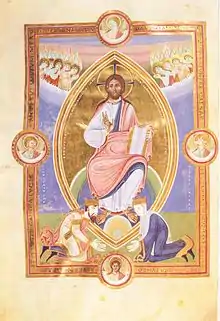 L'entrée de Gisèle à l'église, enluminure dans les Péricopes d'Henri III, Echternach (vers 1039). | |