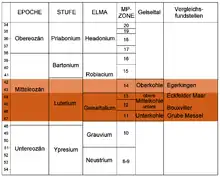 Pour une détermination précise de l'âge du lignite du Geiseltal, les restes de la faune sont importants, en particulier ceux des mammifères, qui permettent une comparaison avec d'autres gisements fossillifères et des conclusions. Cette détermination de l'âge biostratigraphique est largement définie par les modifications de la morphologie des dents de groupes bien définis de mammifères, ce qui permet de déduire la présence dans le temps d'espèces et de genres maintenant disparus. Les premiers fossiles de vertébrés découverts au début du XXe siècle, des restes de dents du parent du tapir, le lophiodon, ont permis l'insertion du lignite dans l'époque géologique de l'éocène moyen. C'est ainsi que l'on a pu déterminer avec précision l'âge relatif des lignites, qui n'avait jusque là été que supposée[96]. L'éocène moyen a un âge de 47,8 à 41,3 millions d'années et est composé d'une couche inférieure, le lutetium et d'une couche supérieure, le bartonium. Par la présence de certaines formes de mammifères, l'âge précis du lignite du Geiseltal peut être assez précisément déterminé. On place ainsi les riches fossiles du filon inférieur jusqu'au filon moyen supérieur dans la zone du geiseltalium, une période au sein de la stratigraphie des mammifères terrestres européens (European Land Mammal Ages, ELMA). La faune du Geiseltal sert de référence pour le geiseltalium, qui forme un segment moyen du lutetium. Les quelques fossiles du niveau supérieur sont placés dans une zone plus récente, le robiacium. Le début du geiseltalium va ainsi de l'apparition des formes précoces du cheval primitif propalaeotherium, mais aussi de son parent le lophiotherium, ou du primate europolemur, tandis que sa fin est indiquée par la première apparition de primates comme l'adapis[14],[97].