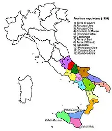 | Capitanata | San Severo, Lucera, Foggia | À l'origine, une seule province nommée Apulia ou Puglia. Alphonse I l'a partagée en trois[4]. |