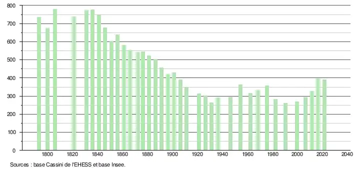 L'évolution du nombre d'habitants est connue à travers les recensements de la population effectués dans la commune depuis 1793. Pour les communes de moins de 10 000 habitants, une enquête de recensement portant sur toute la population est réalisée tous les cinq ans, les populations légales des années intermédiaires étant quant à elles estimées par interpolation ou extrapolation[19]. Pour la commune, le premier recensement exhaustif entrant dans le cadre du nouveau dispositif a été réalisé en 2006[20].