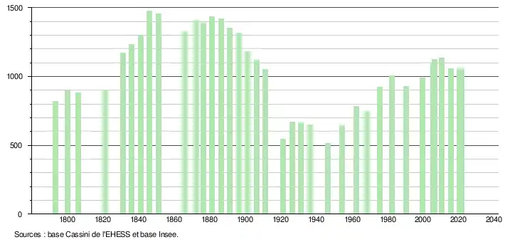 L'évolution du nombre d'habitants est connue à travers les recensements de la population effectués dans la commune depuis 1793. Pour les communes de moins de 10 000 habitants, une enquête de recensement portant sur toute la population est réalisée tous les cinq ans, les populations légales des années intermédiaires étant quant à elles estimées par interpolation ou extrapolation[23]. Pour la commune, le premier recensement exhaustif entrant dans le cadre du nouveau dispositif a été réalisé en 2005[24].