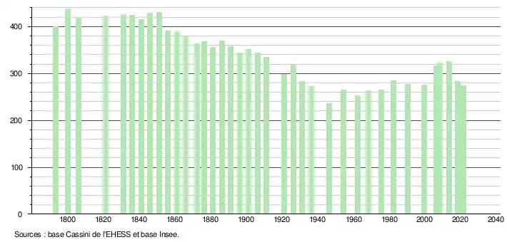 L'évolution du nombre d'habitants est connue à travers les recensements de la population effectués dans la commune depuis 1793. Pour les communes de moins de 10 000 habitants, une enquête de recensement portant sur toute la population est réalisée tous les cinq ans, les populations légales des années intermédiaires étant quant à elles estimées par interpolation ou extrapolation[16]. Pour la commune, le premier recensement exhaustif entrant dans le cadre du nouveau dispositif a été réalisé en 2008[17].