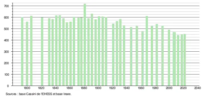 L'évolution du nombre d'habitants est connue à travers les recensements de la population effectués dans la commune depuis 1793. Pour les communes de moins de 10 000 habitants, une enquête de recensement portant sur toute la population est réalisée tous les cinq ans, les populations légales des années intermédiaires étant quant à elles estimées par interpolation ou extrapolation[25]. Pour la commune, le premier recensement exhaustif entrant dans le cadre du nouveau dispositif a été réalisé en 2007[26].