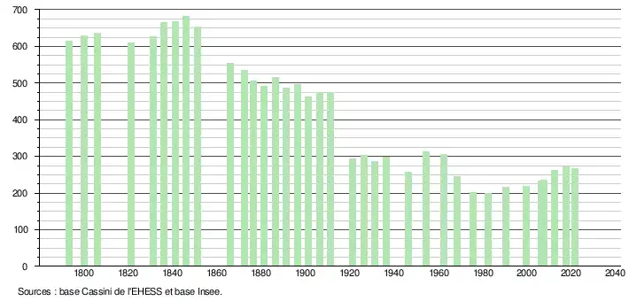 L'évolution du nombre d'habitants est connue à travers les recensements de la population effectués dans la commune depuis 1793. Pour les communes de moins de 10 000 habitants, une enquête de recensement portant sur toute la population est réalisée tous les cinq ans, les populations légales des années intermédiaires étant quant à elles estimées par interpolation ou extrapolation[20]. Pour la commune, le premier recensement exhaustif entrant dans le cadre du nouveau dispositif a été réalisé en 2007[21].
