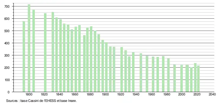 L'évolution du nombre d'habitants est connue à travers les recensements de la population effectués dans la commune depuis 1793. Pour les communes de moins de 10 000 habitants, une enquête de recensement portant sur toute la population est réalisée tous les cinq ans, les populations légales des années intermédiaires étant quant à elles estimées par interpolation ou extrapolation[16]. Pour la commune, le premier recensement exhaustif entrant dans le cadre du nouveau dispositif a été réalisé en 2007[17].