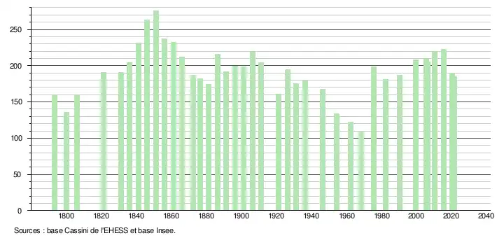 L'évolution du nombre d'habitants est connue à travers les recensements de la population effectués dans la commune depuis 1793. Pour les communes de moins de 10 000 habitants, une enquête de recensement portant sur toute la population est réalisée tous les cinq ans, les populations légales des années intermédiaires étant quant à elles estimées par interpolation ou extrapolation[19]. Pour la commune, le premier recensement exhaustif entrant dans le cadre du nouveau dispositif a été réalisé en 2005[20].