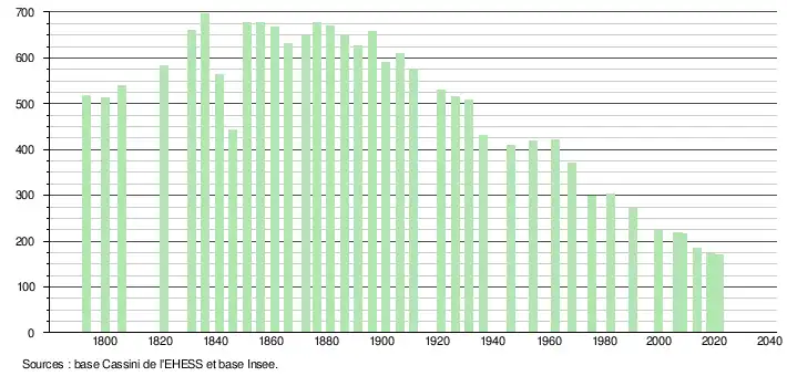 L'évolution du nombre d'habitants est connue à travers les recensements de la population effectués dans la commune depuis 1793. Pour les communes de moins de 10 000 habitants, une enquête de recensement portant sur toute la population est réalisée tous les cinq ans, les populations légales des années intermédiaires étant quant à elles estimées par interpolation ou extrapolation[14]. Pour la commune, le premier recensement exhaustif entrant dans le cadre du nouveau dispositif a été réalisé en 2008[15].
