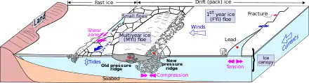La zone de glace de dérive peut être divisée en une zone de cisaillement, une zone de glace marginale et un pack central[4]. La banquise se compose de floes, des morceaux individuels de glace de mer de 20 mètres (66 pieds) ou plus de diamètre. Selon la taille de ces floes, on les classe en :