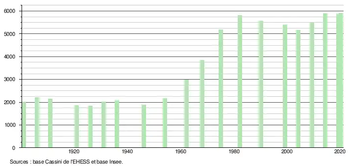 L'évolution du nombre d'habitants est connue à travers les recensements de la population effectués dans la commune depuis 1901. À partir du , les populations légales des communes sont publiées annuellement dans le cadre d'un recensement qui repose désormais sur une collecte d'information annuelle, concernant successivement tous les territoires communaux au cours d'une période de cinq ans. Pour les communes de moins de 10 000 habitants, une enquête de recensement portant sur toute la population est réalisée tous les cinq ans, les populations légales des années intermédiaires étant quant à elles estimées par interpolation ou extrapolation[16]. Pour la commune, le premier recensement exhaustif entrant dans le cadre du nouveau dispositif a été réalisé en 2004[17],[Note 2].
