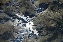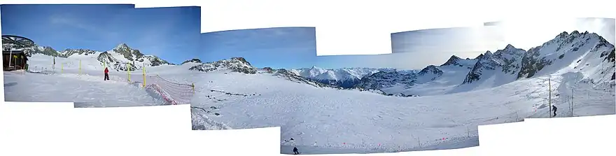 Vue depuis la cime de Caron à l'ouest de l'aiguille de Péclet avec sur son adret à droite la partie amont du glacier de Chavière. | |||