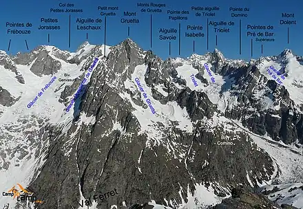 Vue panoramique légendée du massif du Mont-Blanc dans le val Ferret.
