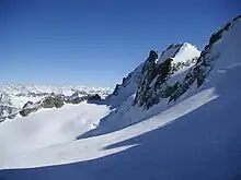 Le glacier de la Girose entre le pic de la Grave à gauche et la pointe de Muretouse à droite vus depuis le plateau d'Emparis au nord. | ||||