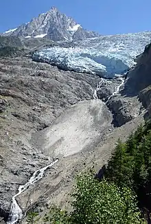 La convergence des deux masses de glace provenant du mont Blanc et du mont Blanc du Tacul donne naissance à une importante moraine médiane. Sa langue terminale a désormais régressé, mais elle atteignait environ 1 200 mètres d'altitude dans les années 1980. Le bassin versant occupe 17 km2 dont 10 km2 sont englacés[10]. L'épaisseur de la glace est de vingt mètres au sommet et atteint un maximum de 170 mètres. D'un point de vue géologique, le glacier repose dans sa partie supérieure sur un granite calco-alacalin avec de grands cristaux de feldspaths pluricentimétriques. Plus en aval, il passe sur un complexe formé d'orthogneiss, de paragneiss et de micaschistes[10].
