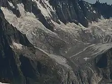 Le glacier du Moine sous l'aiguille du Moine encadrés par les glaciers de la Charpoua (à gauche) et de Talèfre (à droite), le tout dominé par les Drus (à gauche) et l'aiguille Verte (au centre) vus depuis la télécabine Panoramic Mont-Blanc au sud-ouest.