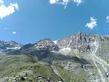 Vue en contre-plongée depuis le mont Fréty au sud-est du glacier du Mont-Fréty dominé par la pointe Helbronner à gauche et la dent de Jétoula à droite.