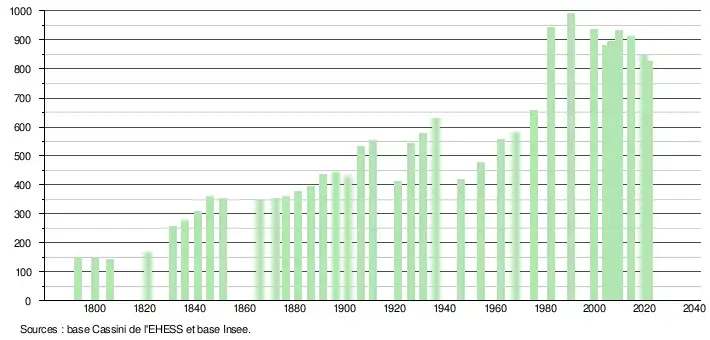 L'évolution du nombre d'habitants est connue à travers les recensements de la population effectués dans la commune depuis 1793. Pour les communes de moins de 10 000 habitants, une enquête de recensement portant sur toute la population est réalisée tous les cinq ans, les populations légales des années intermédiaires étant quant à elles estimées par interpolation ou extrapolation[25]. Pour la commune, le premier recensement exhaustif entrant dans le cadre du nouveau dispositif a été réalisé en 2004[26].