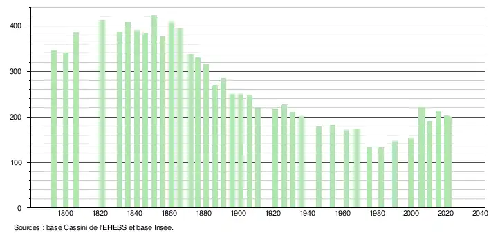 L'évolution du nombre d'habitants est connue à travers les recensements de la population effectués dans la commune depuis 1793. Pour les communes de moins de 10 000 habitants, une enquête de recensement portant sur toute la population est réalisée tous les cinq ans, les populations légales des années intermédiaires étant quant à elles estimées par interpolation ou extrapolation[21]. Pour la commune, le premier recensement exhaustif entrant dans le cadre du nouveau dispositif a été réalisé en 2005[22].